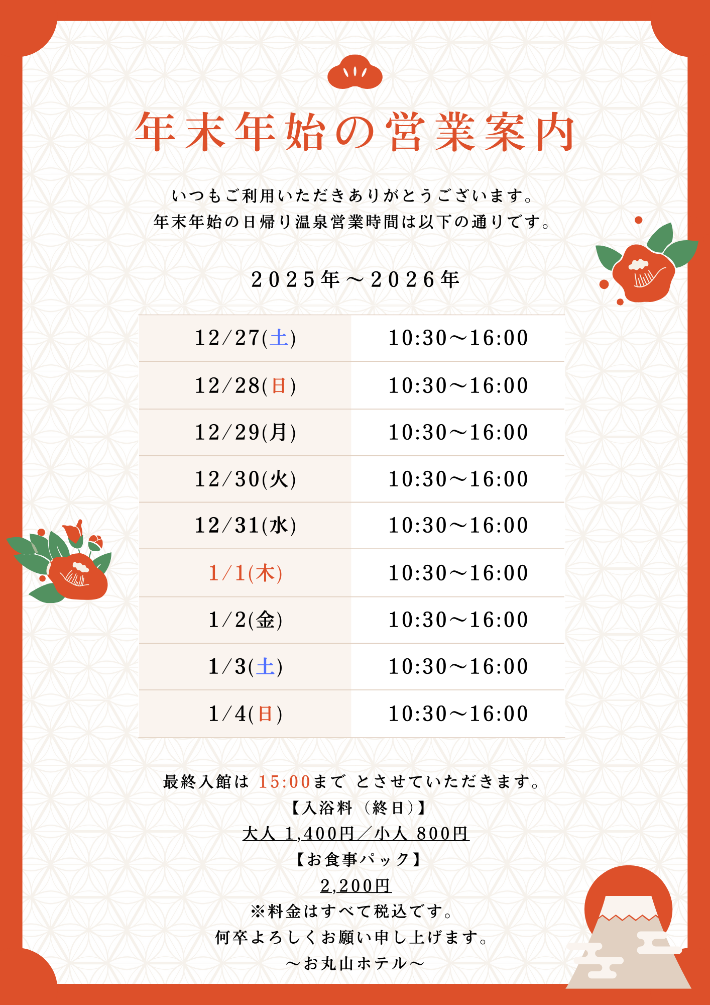 2025年12月28日 【年末年始 日帰り営業のお知らせ🎍♨️】 いつもお丸山ホテルをご利用いただきありがとうございます。年末年始の日帰り営業についてお知らせいたします。 年末年始も、ゆったり温泉で心と身体を癒しませんか♨️✨ランチも通常営業いたします🍴皆さまのご来館を心よりお待ちしております🌿 前の記事 一覧へ戻る