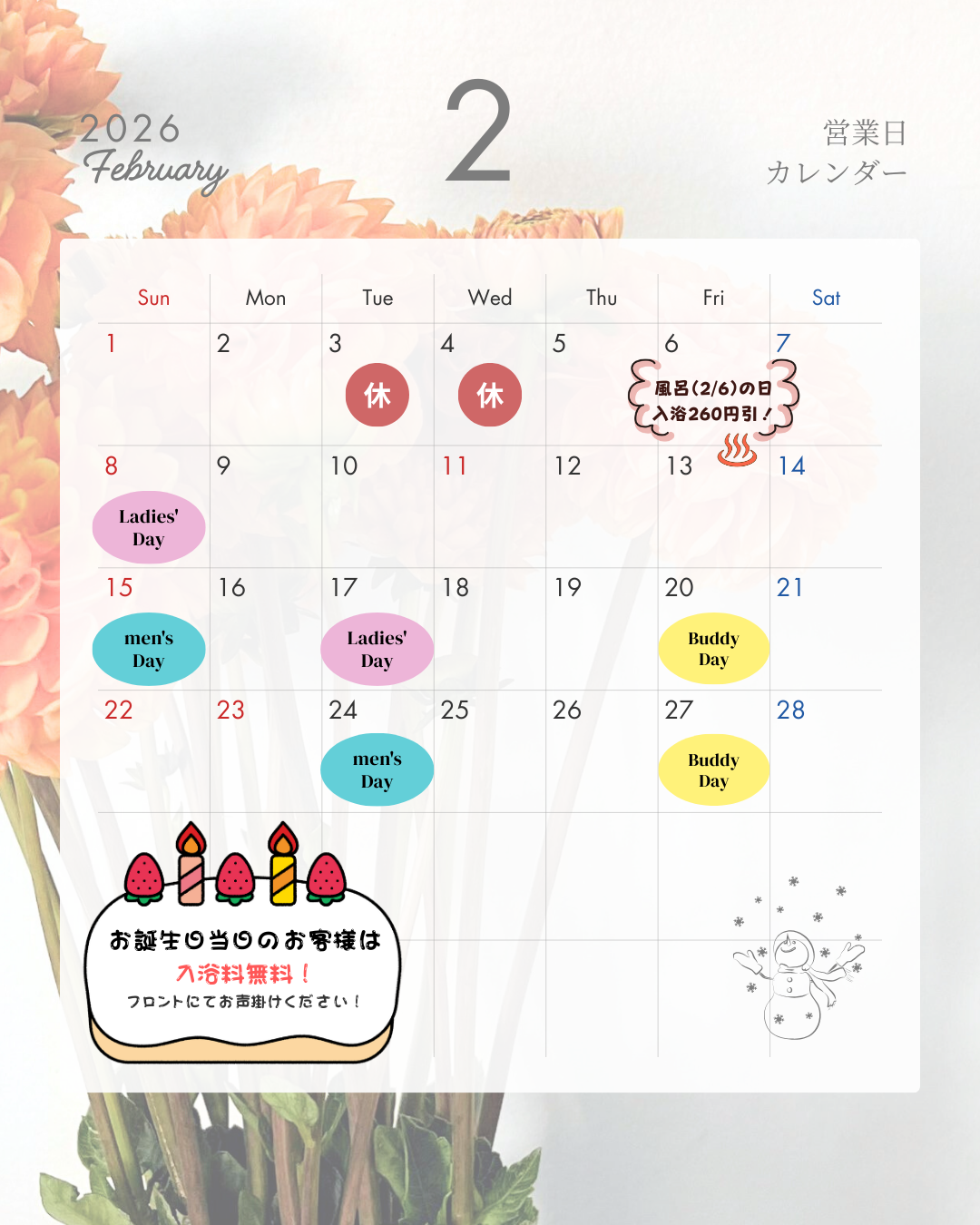 2/6(金)風呂の日|入浴料260円引き♨
